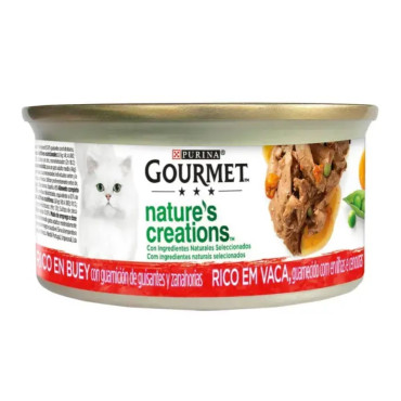 Gourmet Nature's Creations Mini Filetes Vaca, é uma gama de comida húmida para gato com deliciosas receitas de inspiradas pela natureza. Estas receitas são cuidadosamente elaboradas com ingredientes naturais selecionados de elevada qualidade, habilmente cozinhados e ricos em vaca, guarnecidos com legumes. Cada requintada receita é elaborada para que o seu gato, que é um verdadeiro apreciador, possa saborear e ser deliciado a cada momento.